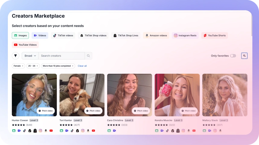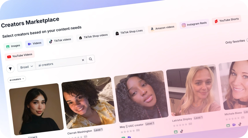 Browse thousands of verified, certified, and vetted TikTok, TikTok Shop, Instagram, YouTube, Amazon, and UGC creators ready to promote your products.