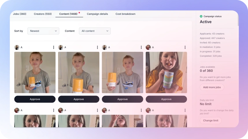 Set detailed targeting: creator niche, location, gender, age, ethnicity, and any special requirements. Add a clear brief so creators know exactly what you want.